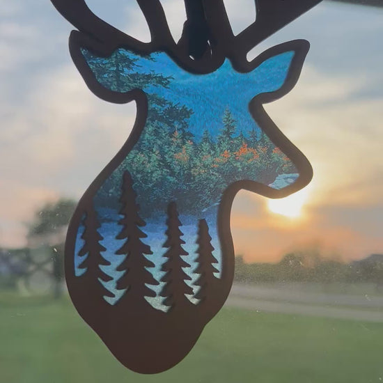 Buck Sky and Trees Suncatcher | Rustic Wooden Car Charm