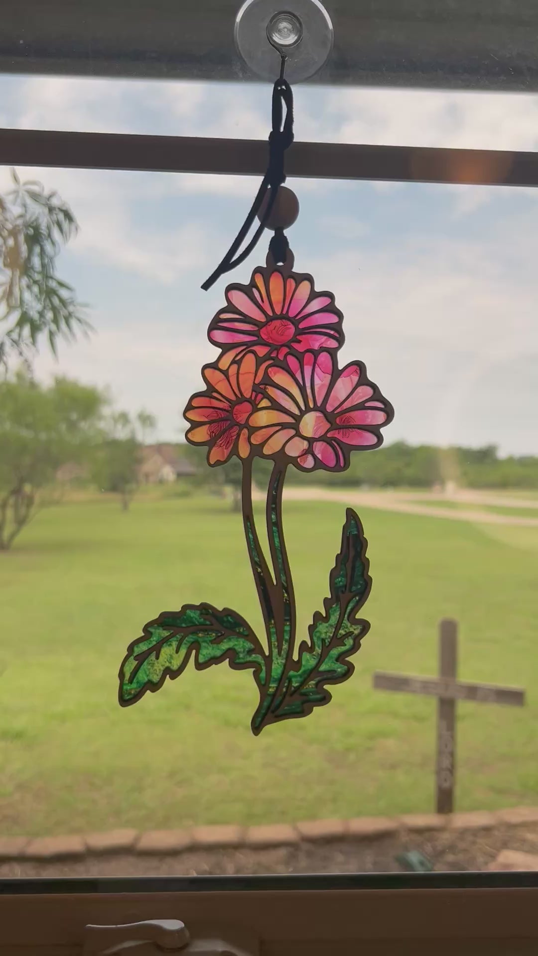 Our Daisy Flower with Stems Suncatcher is a perfect blend of rustic charm and modern elegance. Crafted with meticulous care, this multicolor suncatcher captures the essence of nature with its delicate daisy design. Whether you are a lover of unique handmade window decor or someone who cherishes the rustic, this piece is designed to bring warmth and vibrancy to any space. The stained glass effect, achieved with a harmonious mix of wood and acrylic, creates a captivating dance of colors as sunlight streams through, filling your home with a gentle, natural glow.