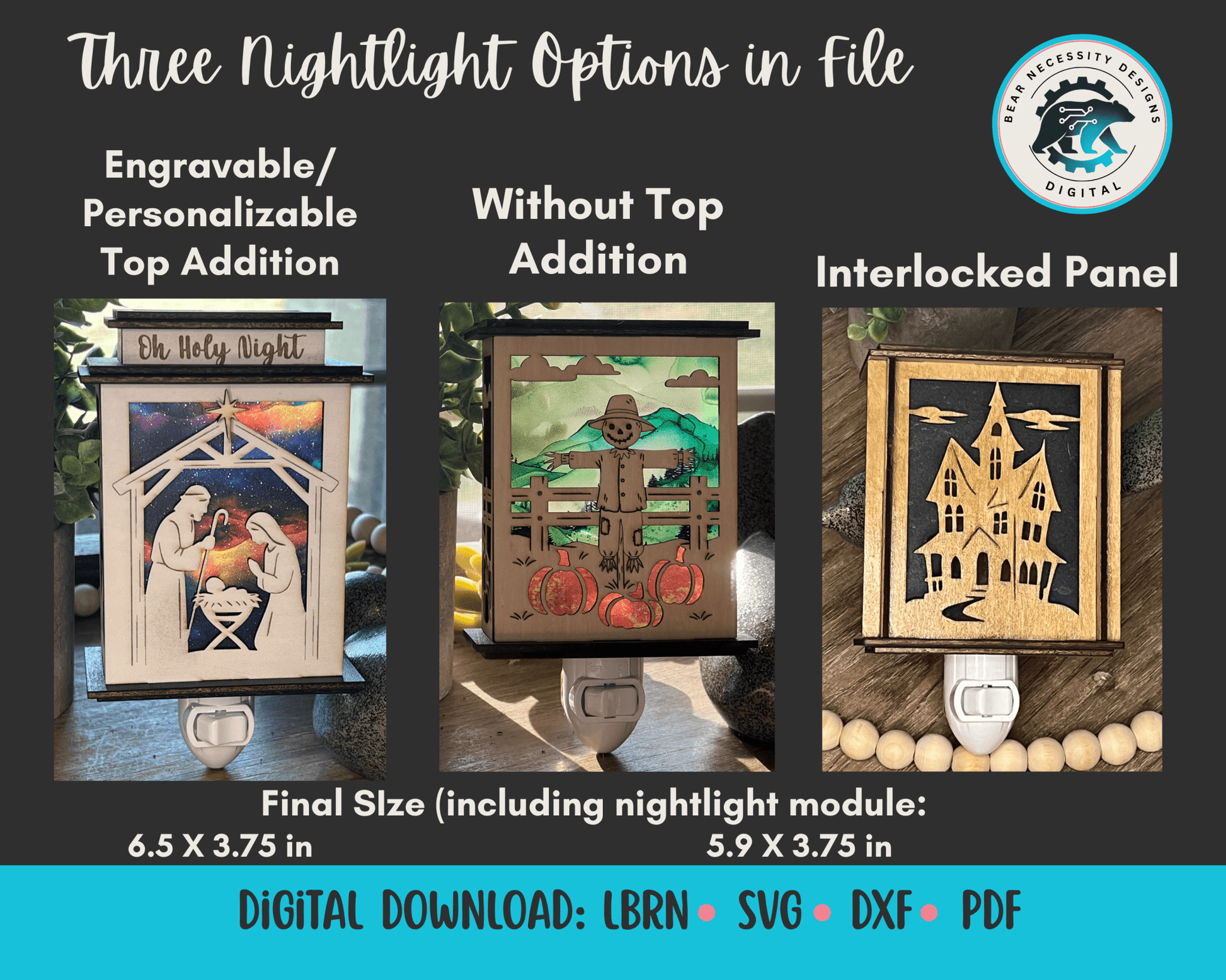 Designed for laser cutters like Glowforge, xTool, OMTech, Thunder, Epilog, and more, this layered cut file transforms into a glowing lantern or plug-in nightlight. Perfect for farmhouse fall décor, Halloween displays, or rustic handmade gifts.