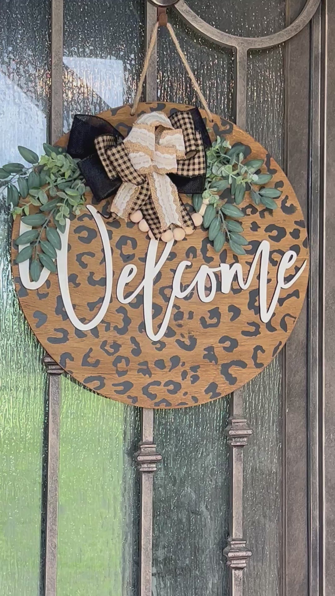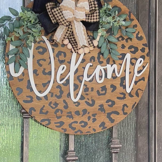 Leopard Print Door Hanger - Rustic Wood Welcome Sign 18" Boho Style