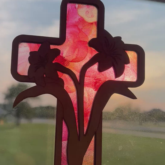 Lily Cross Suncatcher - Multicolor Acrylic & Wood Window Art (5.75 in)