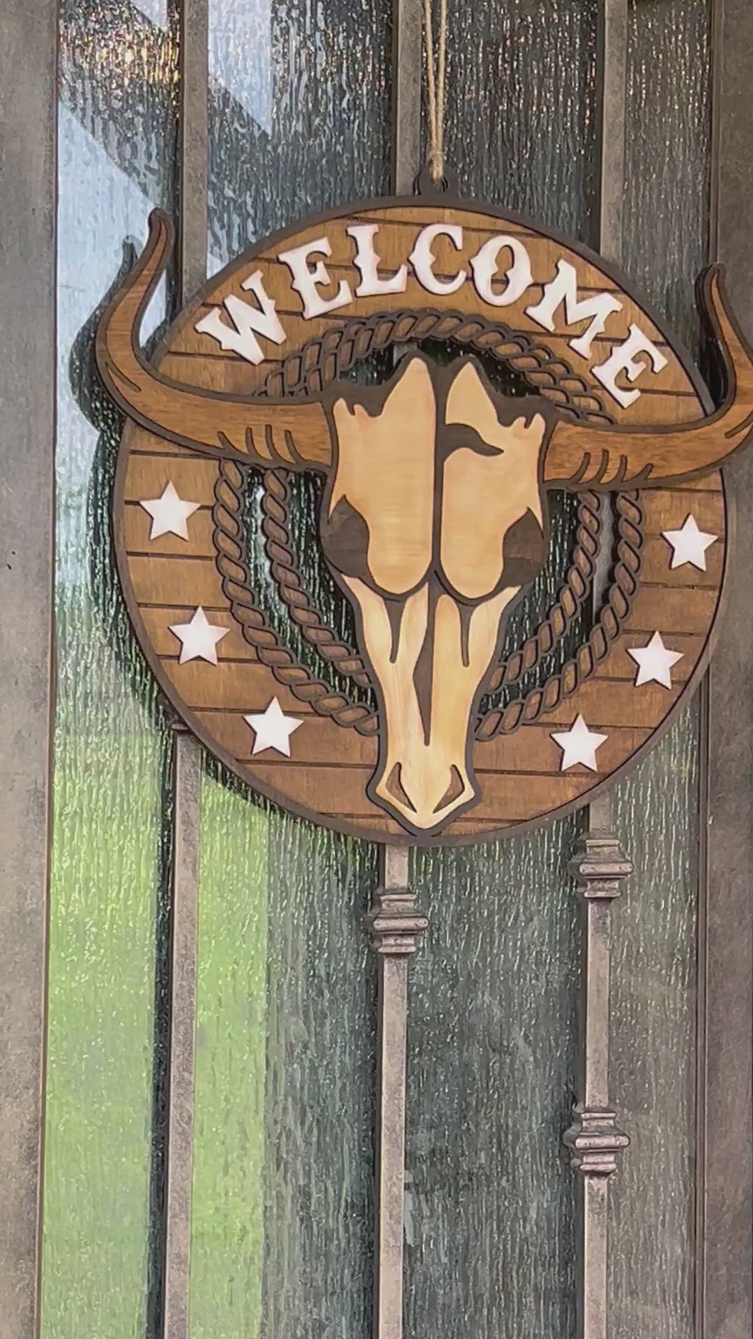 Welcome guests with a touch of rustic elegance with our Longhorn Wood Door or Wall Sign. Crafted from the highest quality natural wood, this 18-inch piece embodies the spirit of the farmhouse decor, blending seamlessly into any rustic or modern setting. Whether adorning your front door or enhancing your interior wall space, this rustic welcome sign offers a warm, inviting atmosphere to your home. Its natural wood grain, enriched with a walnut stain and accented with white detailing, creates a timeless look that complements both traditional and contemporary styles.